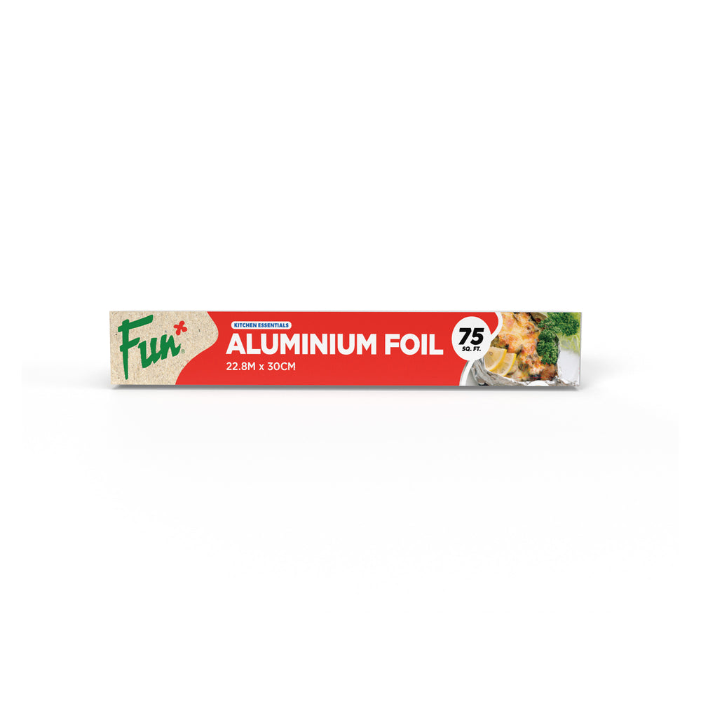 Fun® Indispensable Aluminium Foil is strong, flexible, and water/oil resistant for mess-free use. It's perfect for covering leftovers, cooking, baking, and reheating. The convenient edge cutter makes it easy and safe to tear off. Great for homes, cafeterias, restaurants, and more!