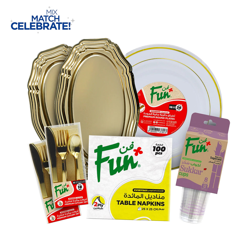 Our plates, serving trays, and cutlery are crafted from high-grade, premium plastic with a stunning gold-look finish. Your guests will be amazed by the realistic appearance and substantial feel, often mistaking them for genuine silverware. This isn't your average disposable dinnerware; it's a statement of refined taste, designed to elevate your table setting and impress even the most discerning eye.