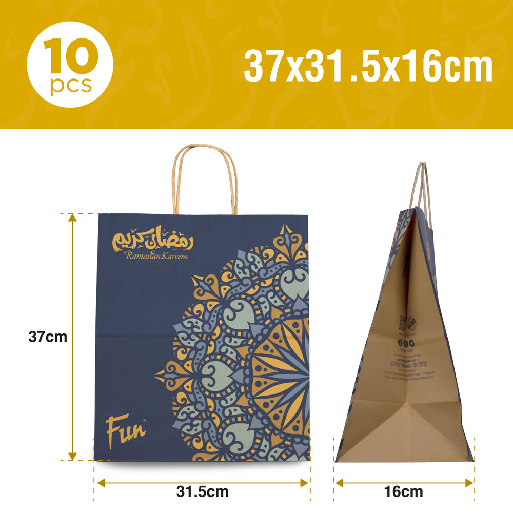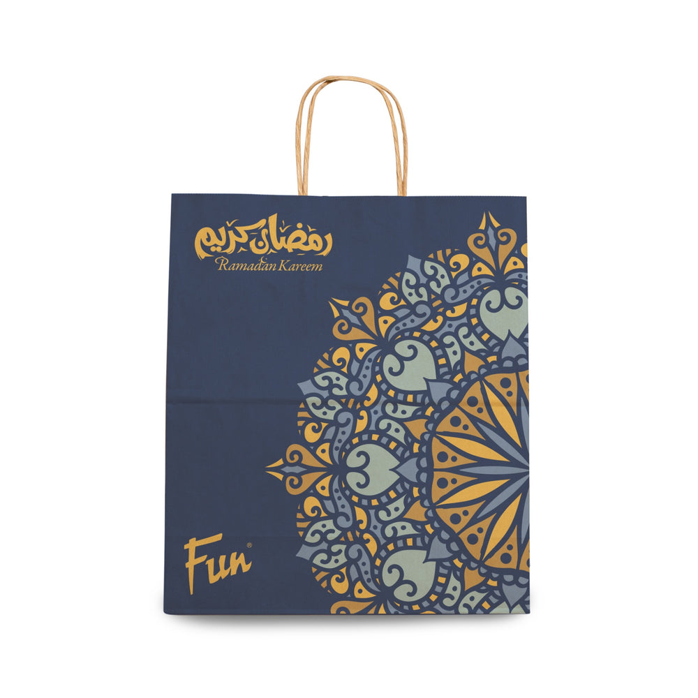 Elevate your gifting experience with these durable and stylish paper bags from "Fun". Crafted to impress, these bags feature a vibrant navy blue background adorned with intricate yellow and turquoise Mandala patterns. The festive look is completed with the greeting "Ramadan Kareem" elegantly printed at the top.