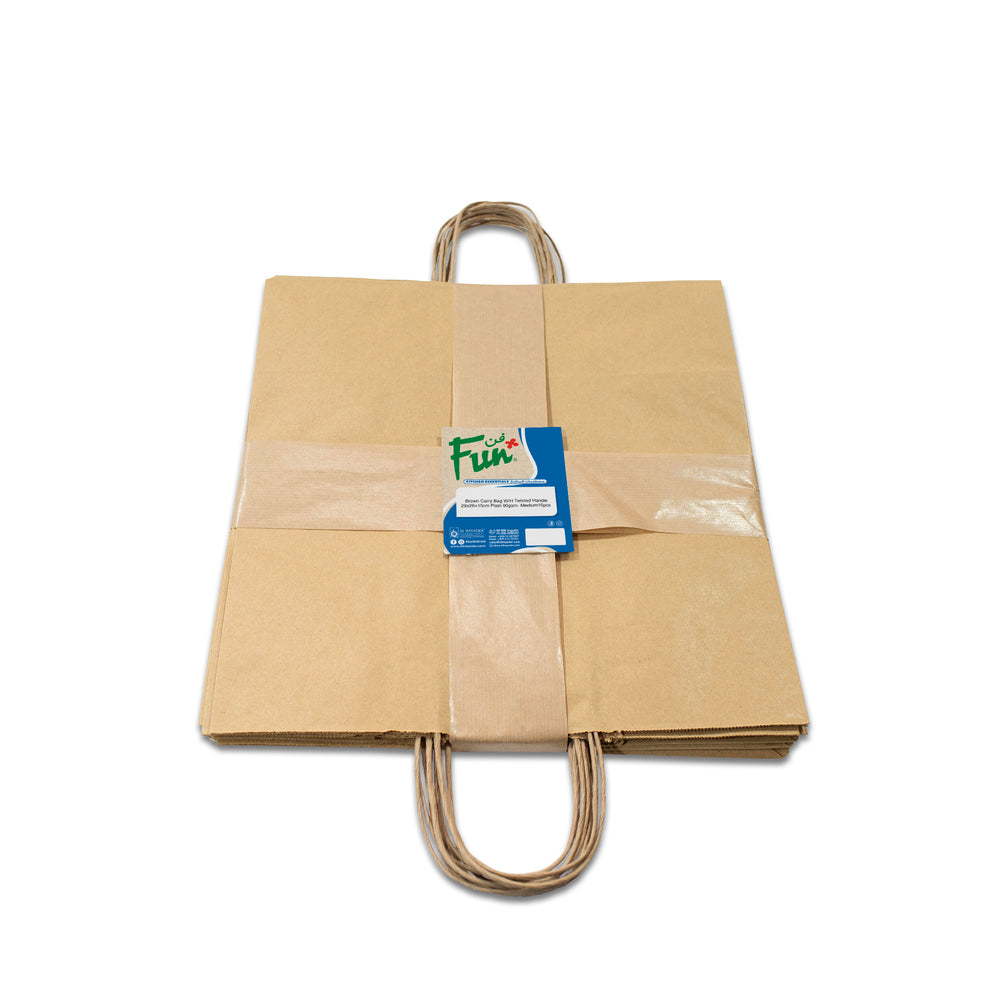 Get ready for a fun and quirky upgrade to your packaging game with the Fun Brown Carry Bag! This pack of 10 comes in a medium size of 29x29x15cm, and features a twisted handle for added convenience. Made with 90gsm paper, this bag is sure to impress (and make your customers smile!).