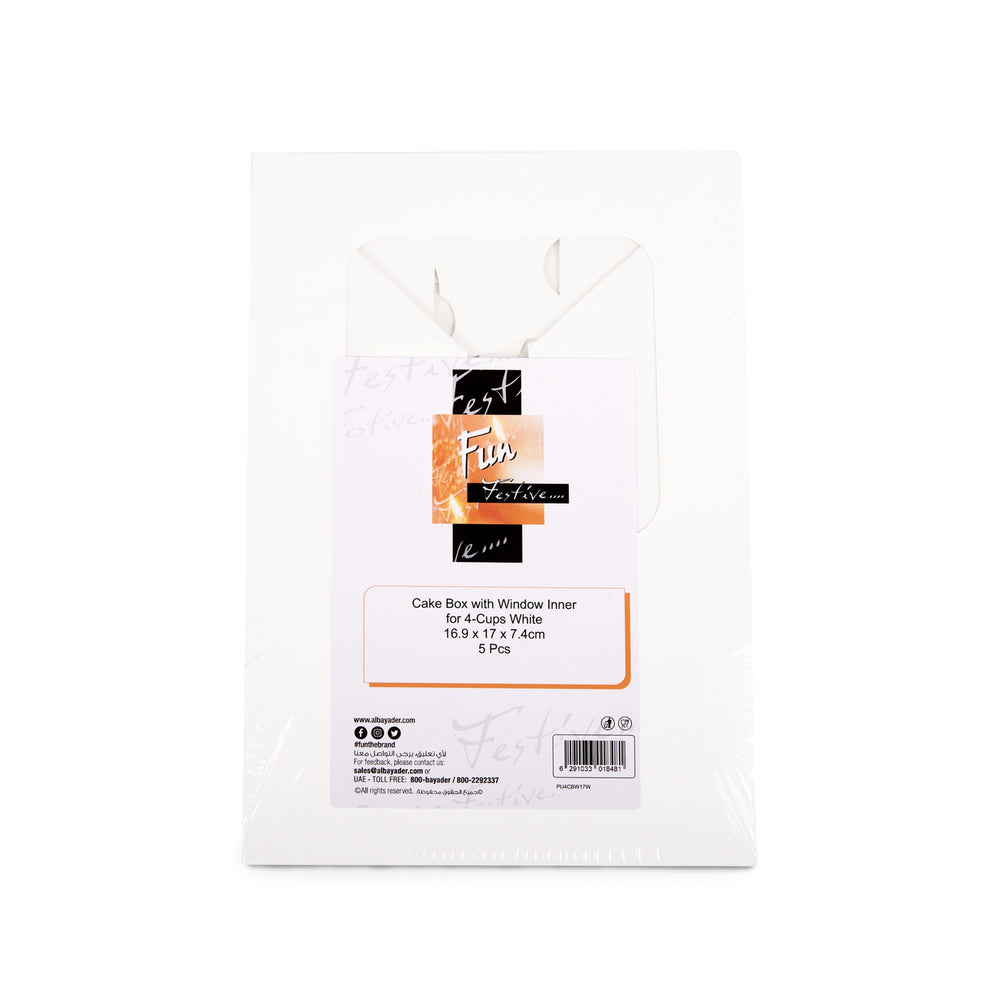 use Fun® Cake Box with a Window and Inner for 4-Cups! This pack of 5 boxes is the perfect size for all your sweet treats at 16.9x17x7.4cm. These boxes are as white as snow and ready to hold all your delicious creations. Don't miss out on this interesting offer!