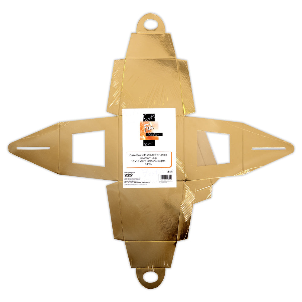 This quirky Fun® cake box pack includes 5 golden, 1-cup boxes with a window, handle, and inner lining for easy transport. Perfect for your next baking adventure - (and maybe sharing with friends, but we won't judge!).