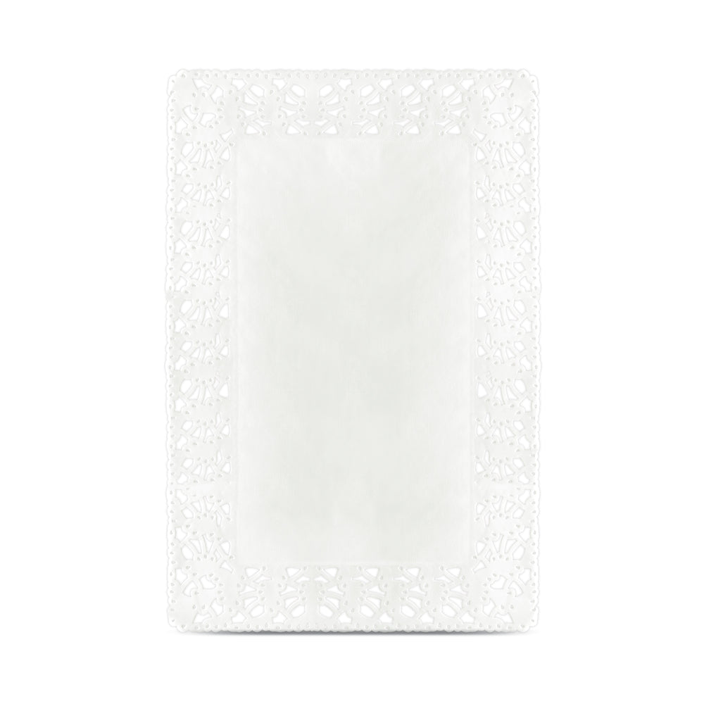 Eco-Smart Tray Liner: A practical 8x12-inch (20.32 cm X 30.48 cm) rectangular paper doily, perfect for lining display cases and serving long pastries. Choose recyclable paper for an easy, green cleanup. Pack of 250.