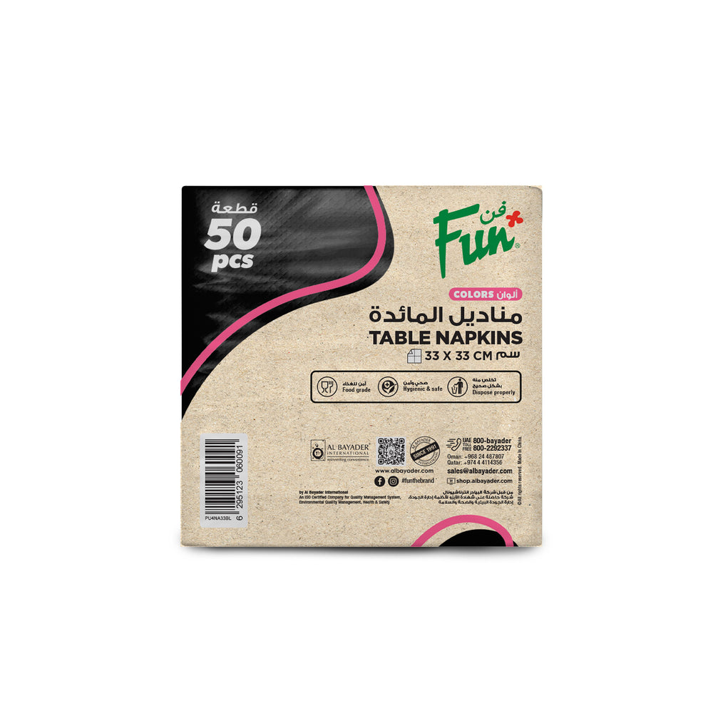 Spice up your gatherings with Fun® 2-Ply Napkins in sleek black. With a generous 33x33cm size and 50 pieces per pack, these napkins are perfect for any occasion. Don't settle for plain, add some fun to your table!