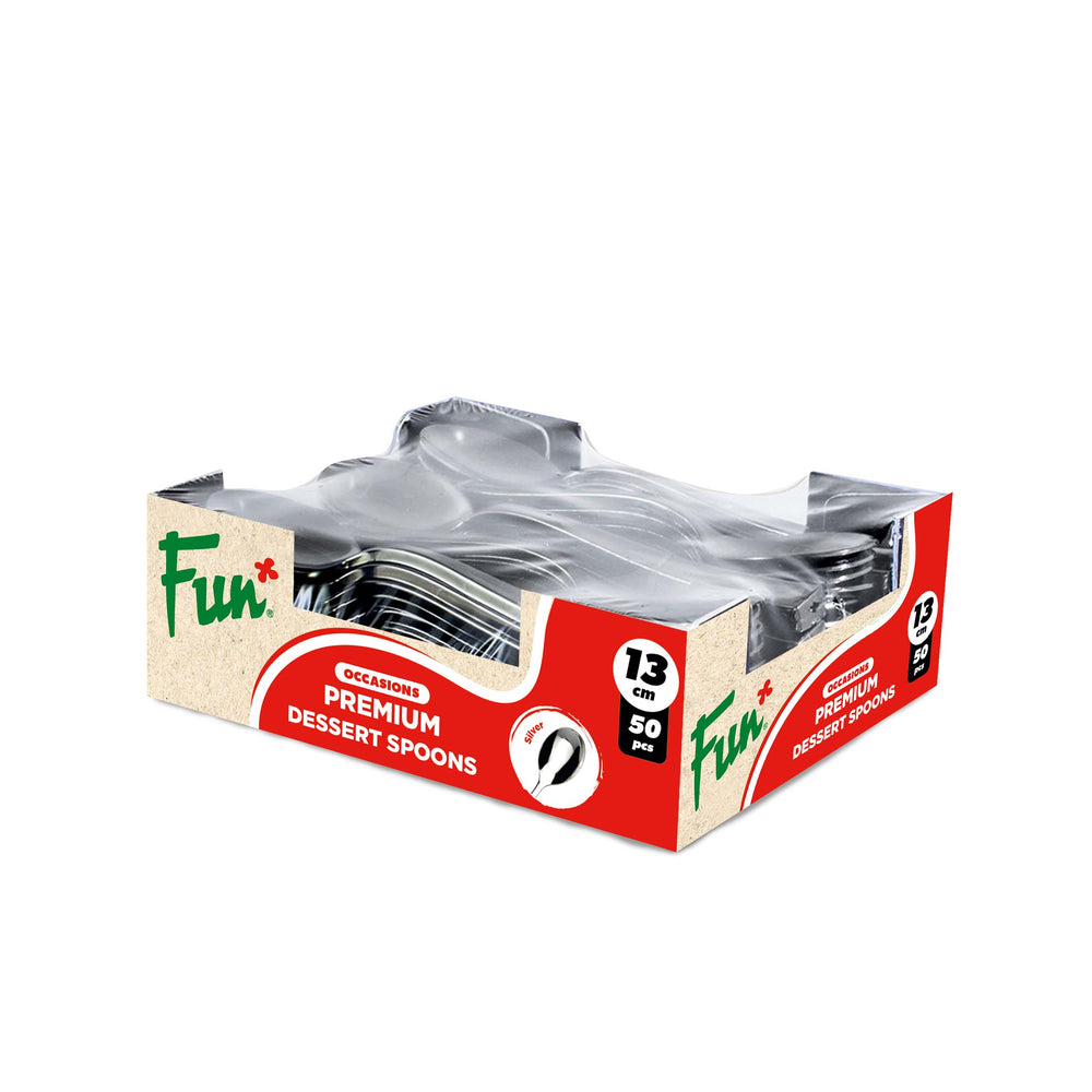 Add some fun and style to your next party with Fun® Plastic Lite Silver Teaspoons! These classy and stylish teaspoons come in a pack of 50, perfect for any gathering. So why settle for boring utensils? Grab a pack and add a touch of personality to your next event!