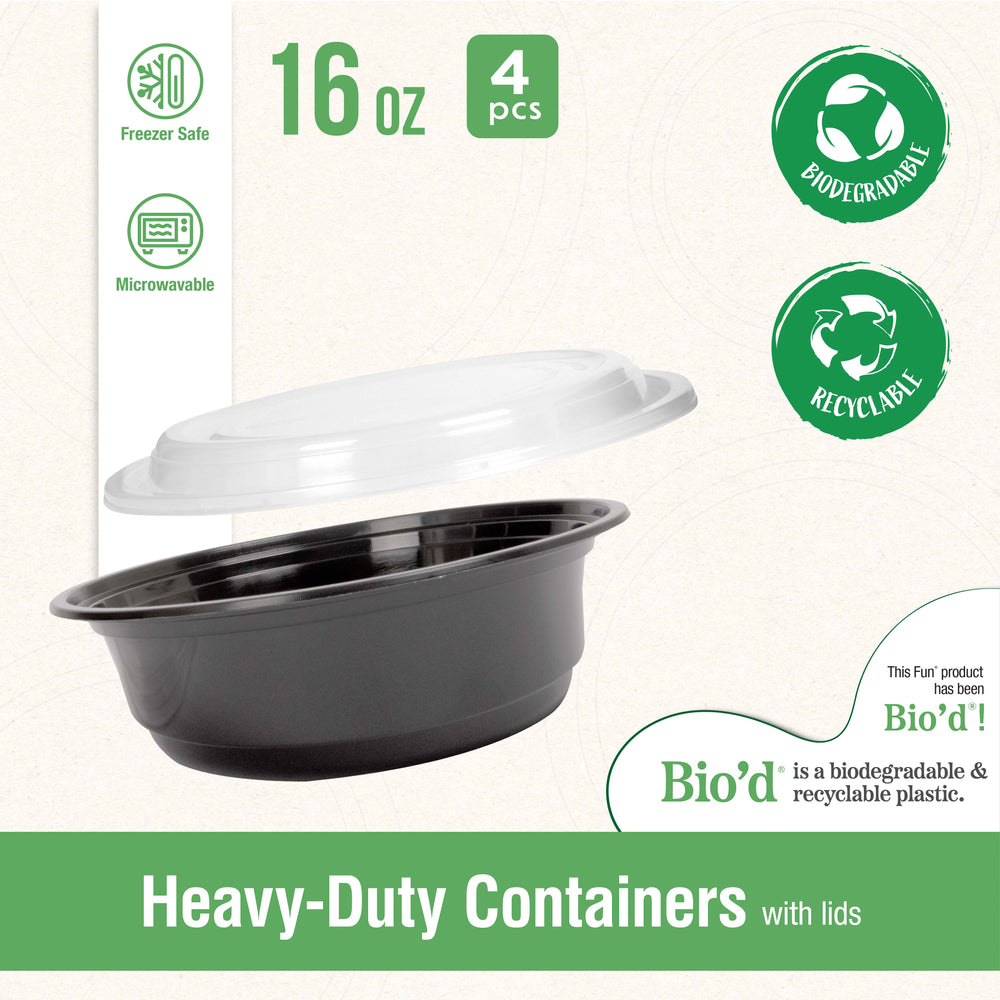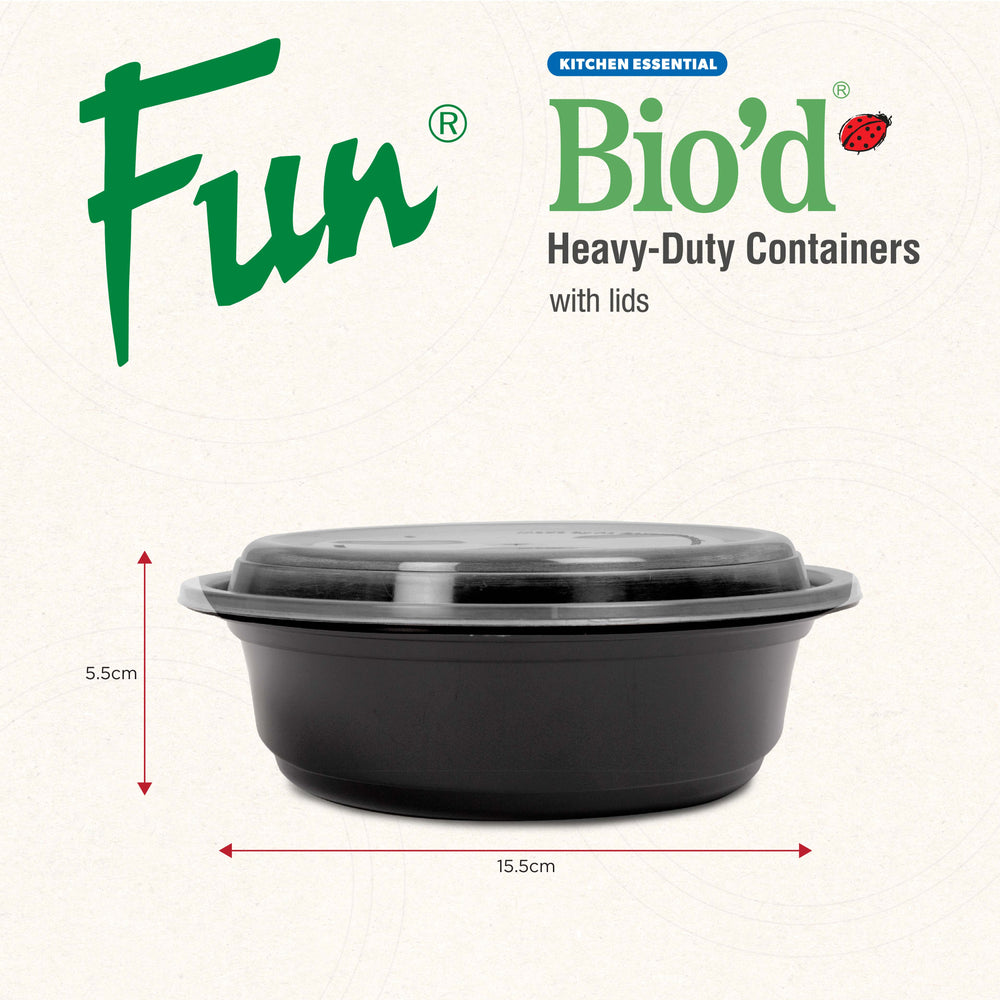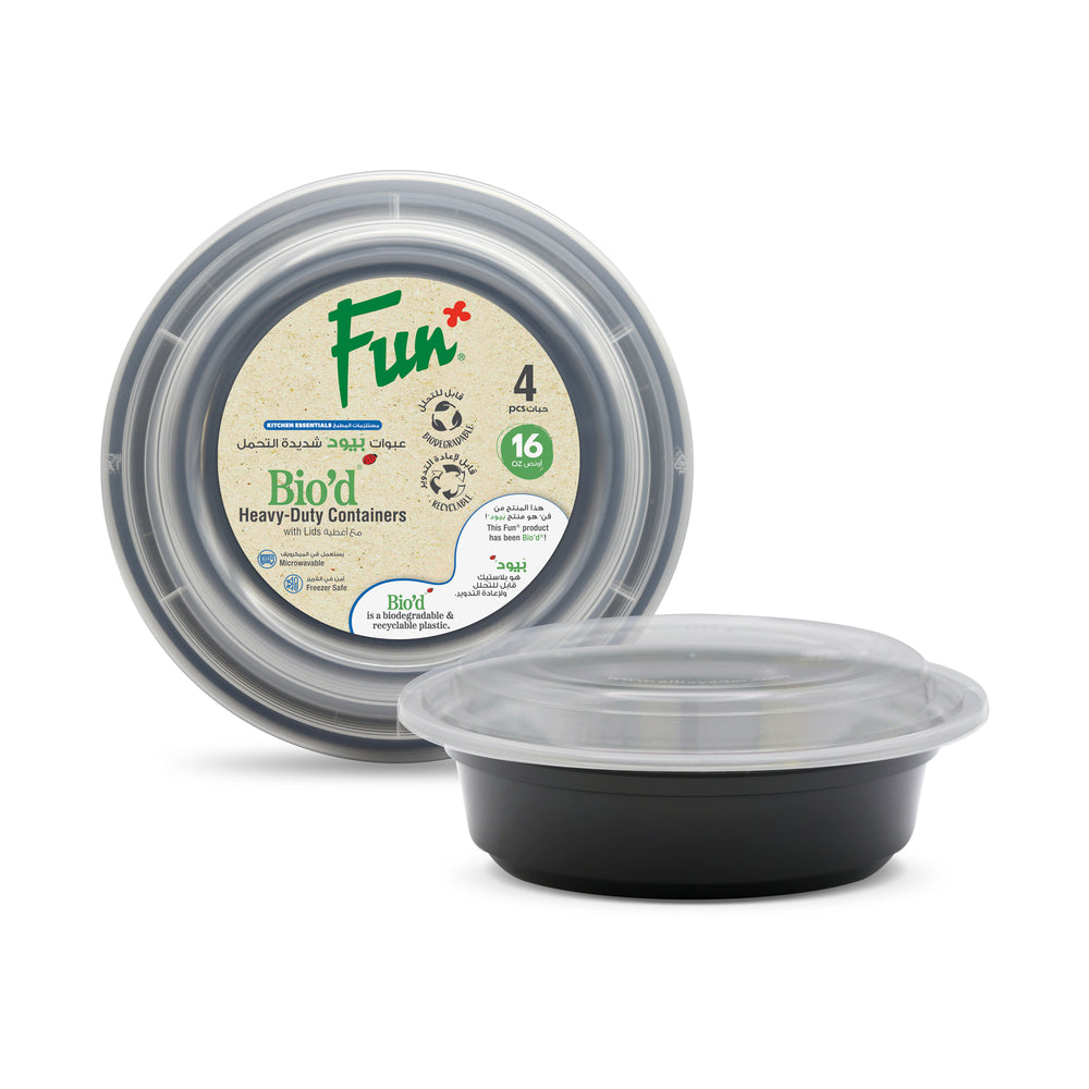 Upgrade your food storage game with Fun® Bio'd Black Round Container! Made from our revolutionary Bio'd material, it's both durable and biodegradable. Perfect for an eco-friendly lifestyle, it's the ideal choice for storing food without harming the environment. Get yours now in a handy 4-piece pack!
