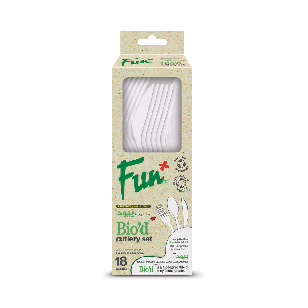 Introducing Fun® Bio'd Premium White Cutlery Set! These 18 pcs come in 1 pkt and feature our innovative biodegradable technology. Not only are they sustainable for the environment, but they also work on various plastics, making them versatile and cost-effective. Perfect for any gathering!