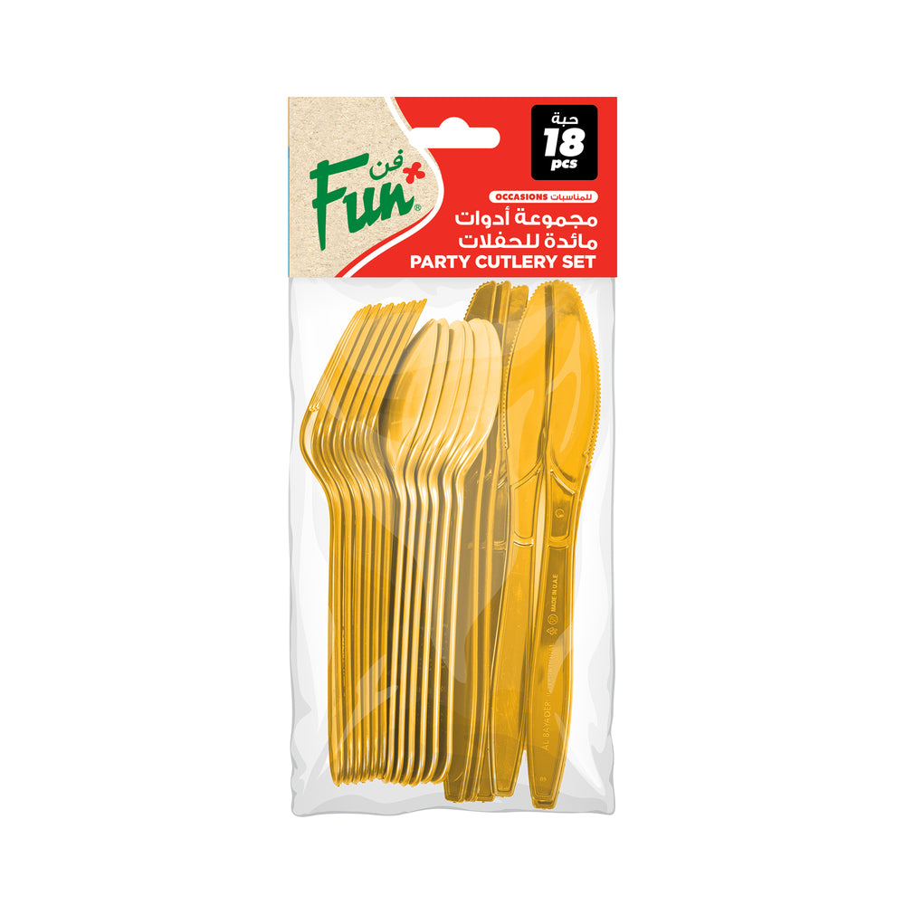Get ready to add a touch of glamour and fun to your dining experience with our Fun® Heavy-Duty Cutlery Set! The golden pack of 18 is sure to impress with its durability and stylish design. Don't settle for boring cutlery, make every meal a party with Fun®!