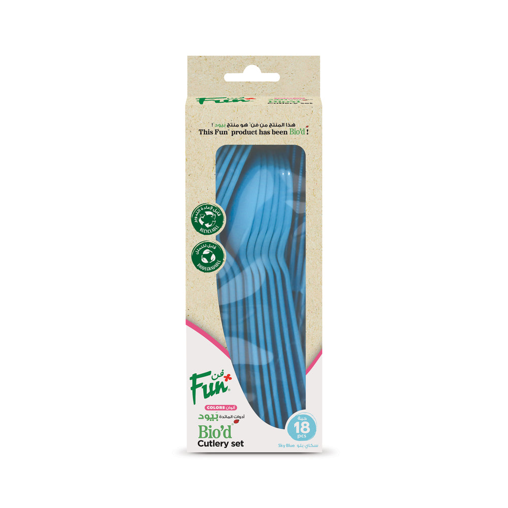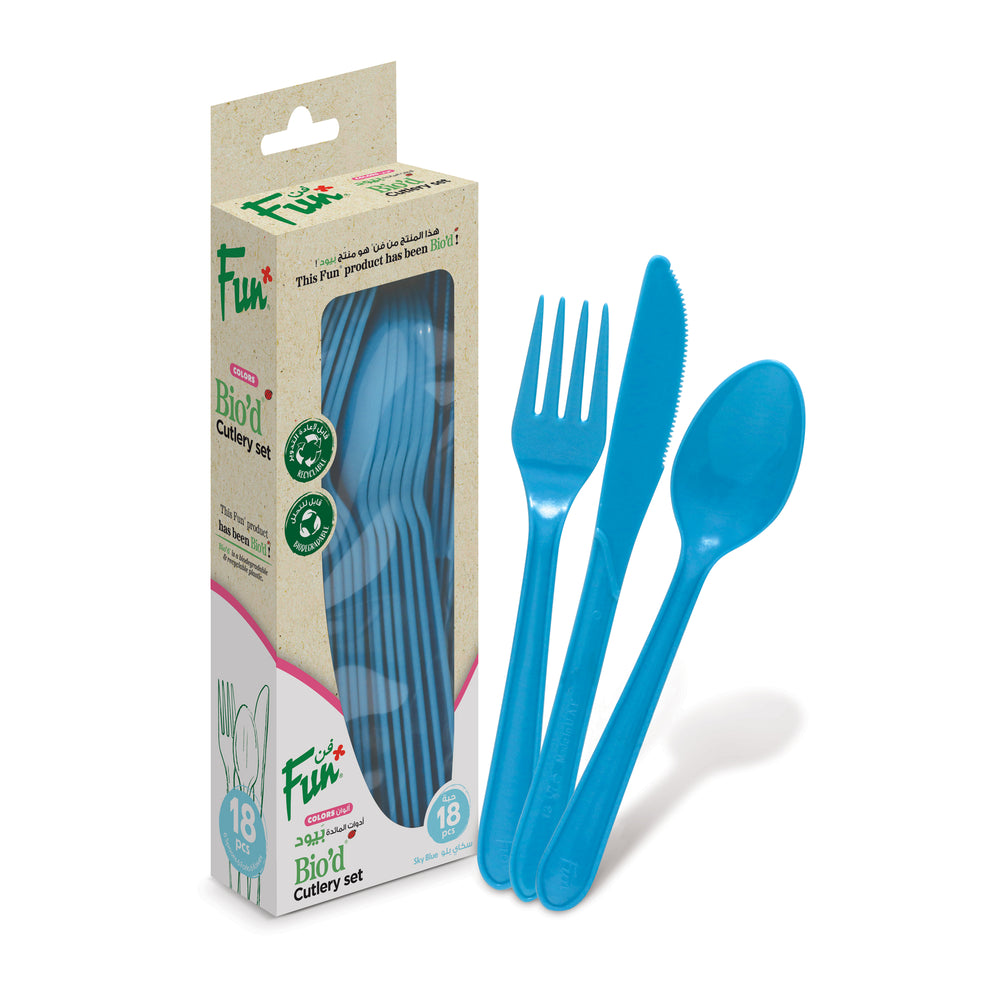 Spice up mealtime with Fun® Bio'd Colors Sky Blue Cutlery Set! Made from our innovative Bio'd'material, this set of 18 pieces will add a pop of color to your dining experience. And with new technology that allows for biodegradation in landfills, you can feel good about your meal and the environment.