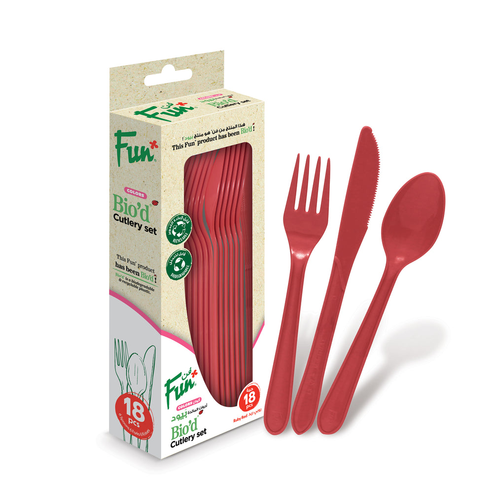 Introducing the Fun® Bio'd Colors Ruby Red Cutlery Set! Made from our innovative Bio'd'material, this set of 18 pieces will add a pop of color to your dining experience. And with new technology that allows for biodegradation in landfills, you can feel good about your meal and the environment.